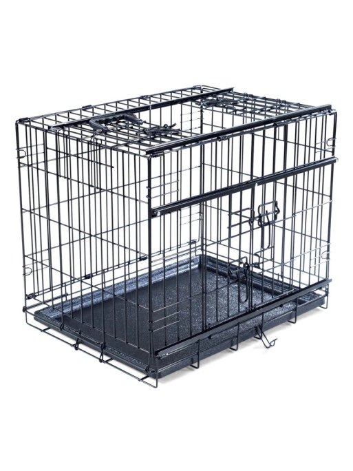 Cette cage pliable est munie de 2 portes d’accès coulissantes, l’un latérale et l’autre est située sur le haut de la cage, chacune équipé d’un loquet.