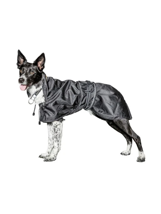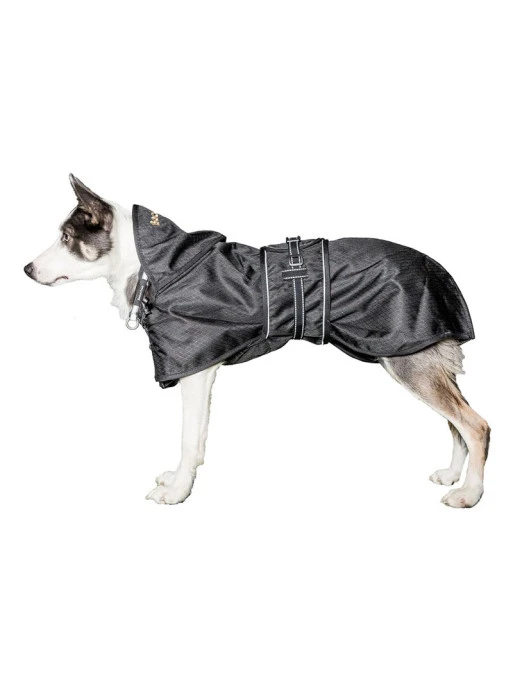 Cette couverture est réglable au niveau du poitrail et du cou pour un ajustement parfait à la morphologie de votre chien de sorte à le protéger au maximum lors de vos balades pluvieuses.