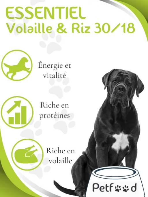 La croquette Essentiel Volaille et riz 30/18 Nature Dog allie des apports en protu00e9ines et graisses issus d’ingru00e9dients qualitatifs avec un apport en cu00e9ru00e9ale exclusivement composu00e9 de riz, cru00e9ant un aliment complet, riche et digeste.