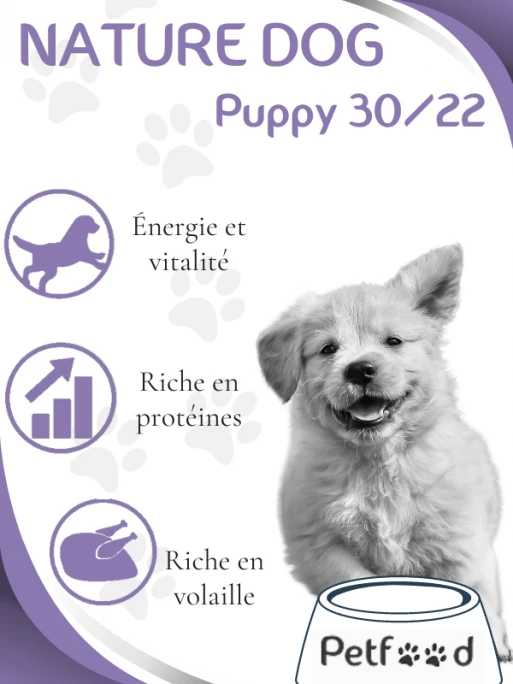 Les croquettes Puppy 30/22 Nature Dog sont parfaitement adaptées aux besoins nutritionnels spécifiques des chiots en début croissance et lors de leurs premiers mois de vie.