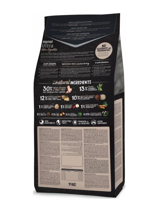 Composu00e9es d’ingru00e9dients naturels, de viande frau00eeche et pauvres en cu00e9ru00e9ale, les croquettes pour chien Ultra de Ownat</strong> assurent une assimilation optimale et un apport u00e9quilibru00e9 en fibres.</h2>n