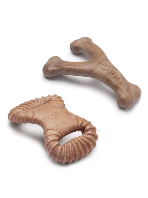 Vendus par 2, les jouets à mâcher Dental Chew et Wishbone Benebone sont tous deux fabriqués à partir d’un nylon plus souple, et permettent aux jeunes chiens de satisfaire leur besoin de mastication quotidien