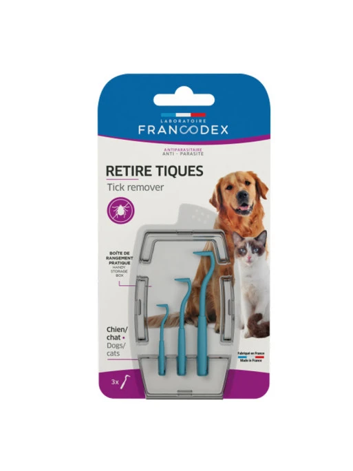 > Dégager les poils et glisser le crochet entre la peau de l’animal et la tique